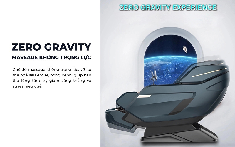 Công nghệ massage không trọng lực “Zero Gravity” là một ứng dụng đắt giá được phát triển bởi NASA(Cơ quan hàng không vũ trụ Mỹ). Trải qua nhiều thập niên, công nghệ không trọng lực Zero Gravity được nghiên cứu, ứng dụng nhiều vào trong lĩnh vực y tế và chăm sóc sức khỏe. Đặc biệt là trong quá trình cải tiến ghế massage thế hệ mới, gây được nhiều tiếng vang lớn bởi những lợi ích tuyệt vời mà nó mang lại cho người dùng. Theo đó các ghế massage không trọng lực có khả năng tạo nên một góc 130 đến 135 độ giữa bụng và đùi qua đó làm giảm đáng kể trọng lực tác động lên cột sống và cơ thể.
