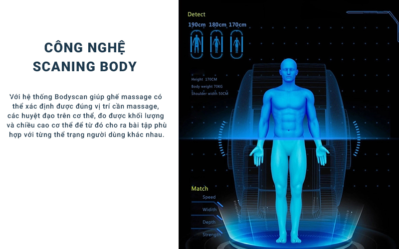 “Body Scan” được dịch ra có nghĩa là “Quét toàn bộ cơ thể” là hệ thống xác định thể trạng người dùng được sử dụng trong các loại ghế massage cao cấp hiện nay. Với hệ thống Bodyscan giúp ghế massage có thể xác định được đúng vị trí cần massage, các huyệt đạo trên cơ thể, đo được khối lượng và chiều cao cơ thể để từ đó cho ra bài tập phù hợp với từng thể trạng người dùng khác nhau.