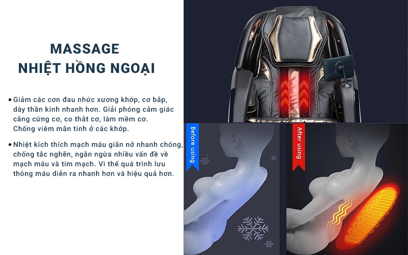 Nhiệt hồng ngoại ở ghế massage hoạt động dựa trên nguyên lý các bước sóng của bức xạ hồng ngoại sẽ trùng với các bước sóng trên cơ thể con người. Dựa trên cơ chế đó, ghế sẽ tự động định vị tất cả huyệt đạo trên toàn bộ cơ thể cùng với ghi nhớ đã được lập trình để thực hiện tất cả động tác xoa bóp bấm huyệt một cách chính xác nhất.